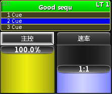 顶部显示选中的执行器的号码,序列的名称,号码,权限,以及跟踪状态。如果执行器运行时,中间部分显示前一个场景,当前场景和下一个场景。底部显示两个推杆的状态及内容,点击打开推杆功能列表,可重新设置推杆的功能,更多的信息可以参考本节最后的链接。