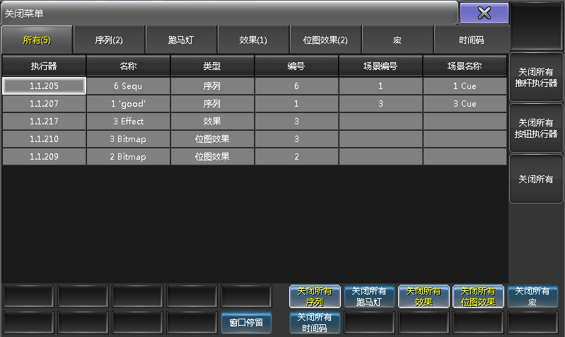 在关闭菜单中也可通过窗口底部的按钮分别关闭各个类型的执行器:关闭所有序列,关闭所有跑马灯,关闭所有位图效果,关闭所有宏,关闭所有时间码。