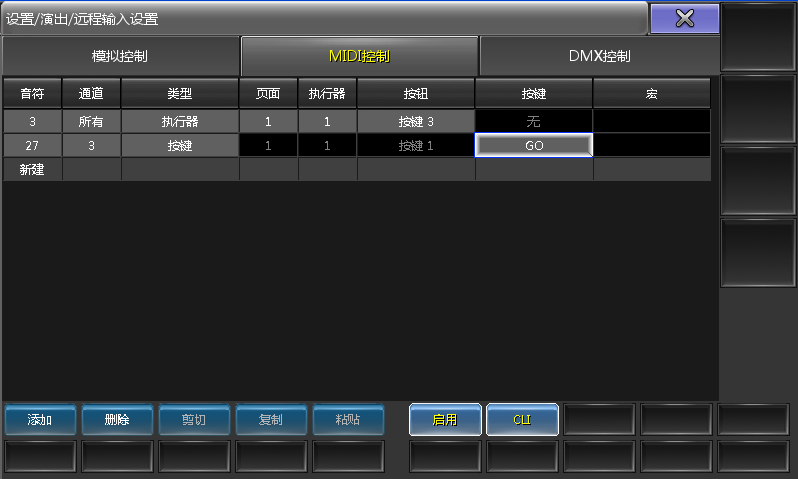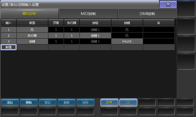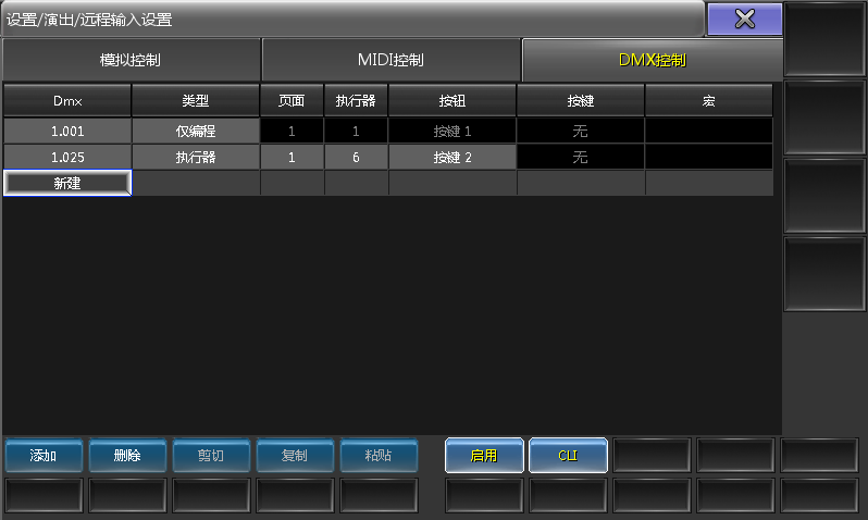 新增每个远程输入时,都会要求选择其类型,共有5种:无,执行器, 宏,按键和编程器(编程器选项只在DMX控制中存在)