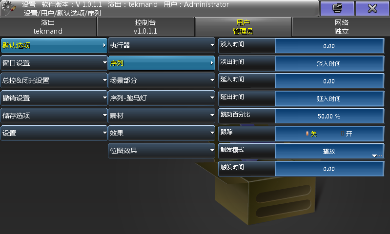 跳动百分比:主要针对一些灯具的属性具有跳动特性(即忽略淡入时间,直接跳到该值),需在灯库中将跳动特性设置为打开。通过设置一定的百分比,从而可控制跳动发生的时间。例如,设置为0%,则跳动在淡入时间刚开始的时候就执行,设置为100%,则跳动在淡入时间结束时才发生。这种特性也可称为跳动百分比。