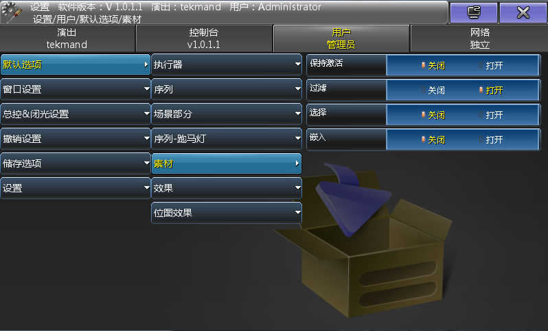 过滤:打开时,只能将素材储存各类型的库中,如果设置关闭,则可以将所有值存储在每一个素材库。素材All不受此项设置的影响。