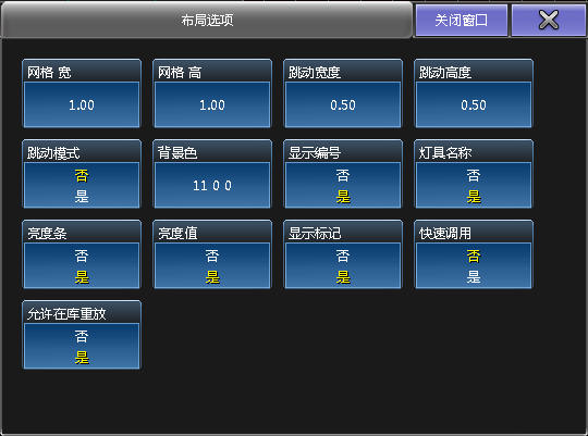 在布局编辑窗口,可以查看并布置部分或者全部灯具,灯组,宏,预设,效果等。其中灯具不是必须的,可以只是灯组,宏等的排列。在此窗口中可以选用不同的符号表示对象,其中的一些符号能够看到灯具的颜色,亮度和图案片,还可以添加文本和方框。