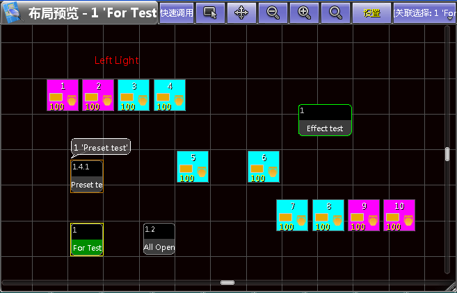 布局编辑窗口具有强大的功能,可以添加灯具,灯组,效果,和预设,并且可以按照自己的想法排布。