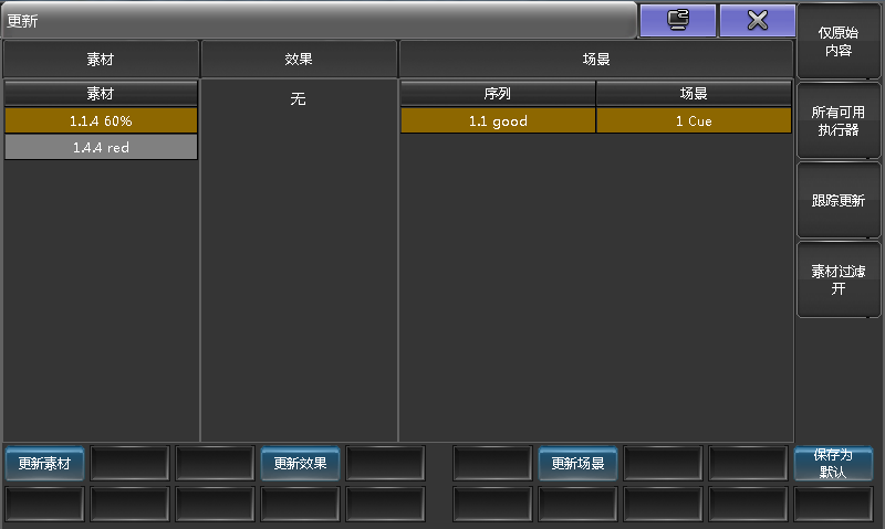 第一个按钮可切换仅原始内容和添加新内容选项。仅原始内容只允许更新素材,效果或场景的原始内容。例如,若一个素材只包含灯具1的颜色信息,就不能为灯具2更新颜色信息,也不能为灯具1更新亮度值信息。